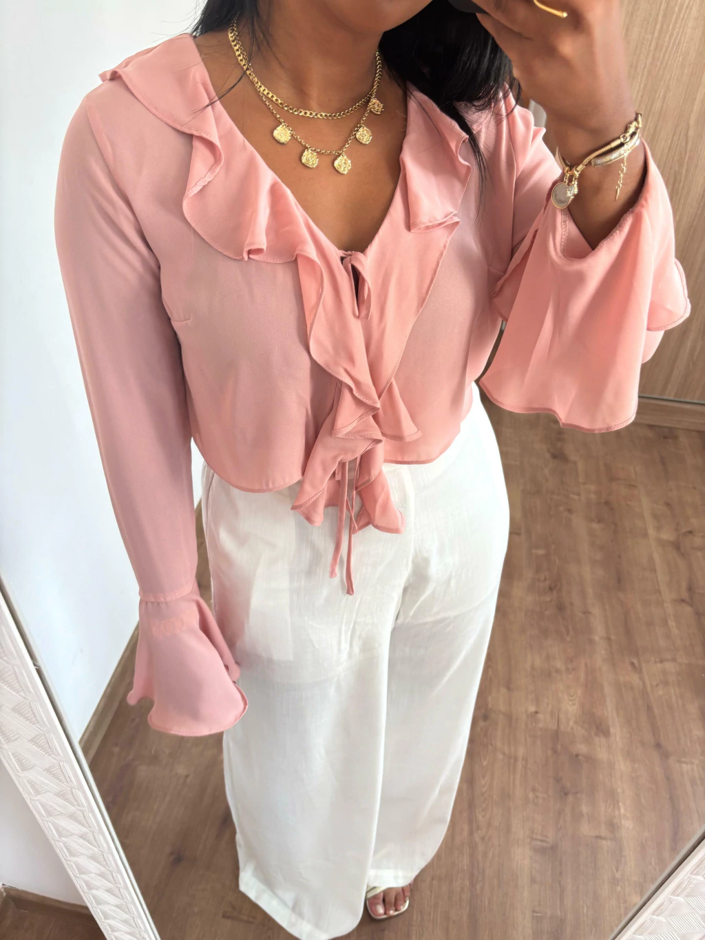 A Blusa Isis de Babado é a escolha ideal para quem busca estilo e conforto. Confeccionada em tecido crepe super fresquinho, esta peça possui uma amarração frontal que valoriza a silhueta e traz um toque de sofisticação ao look.