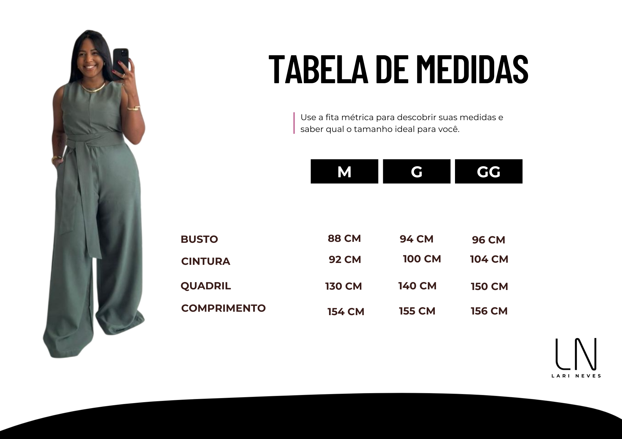 Altura: 1,61m | Busto: 89cm | Cintura: 80cm | Quadril: 108cm