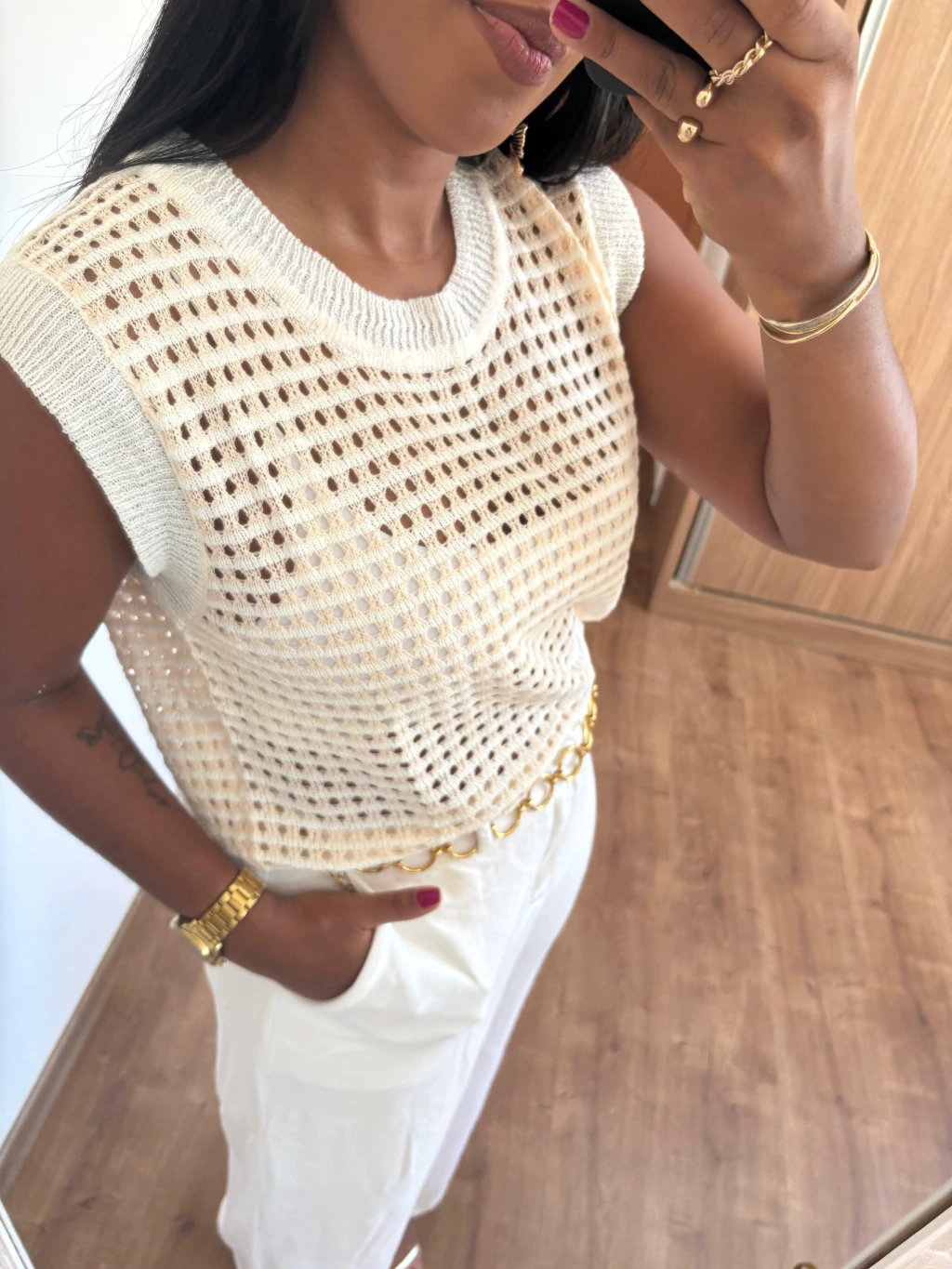 Apresentamos a Regata Milla, uma peça bicolor confeccionada em tricot vazado, que une leveza e modernidade. Com uma textura delicada, esta regata é a escolha perfeita para quem busca versatilidade e estilo.