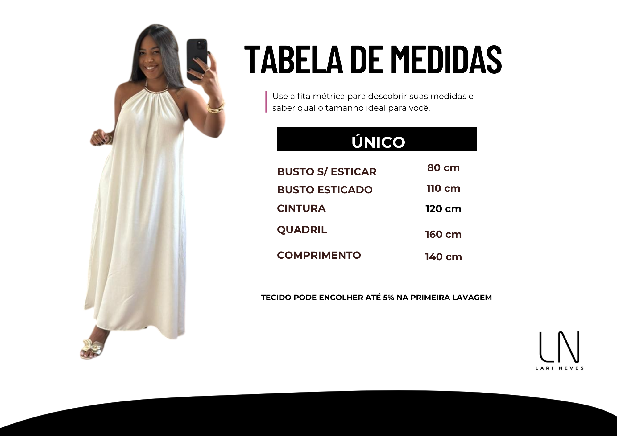 Lastex nas costas que ajusta o vestido ao seu corpo, proporcionando um caimento amplo e confortável.