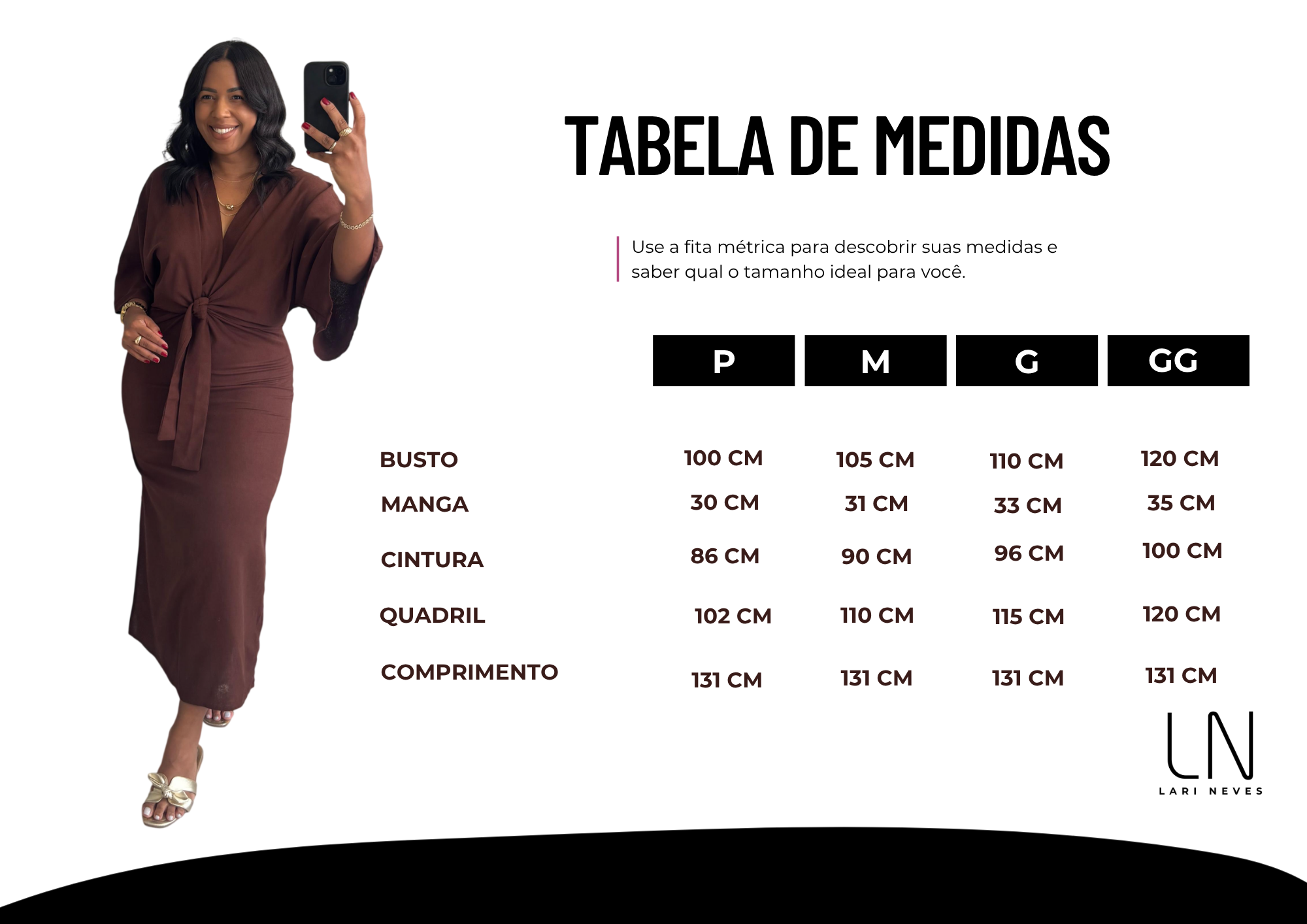 Altura: 1,61 m - Busto: 89 cm - Cintura: 80 cm - Quadril: 108 cm