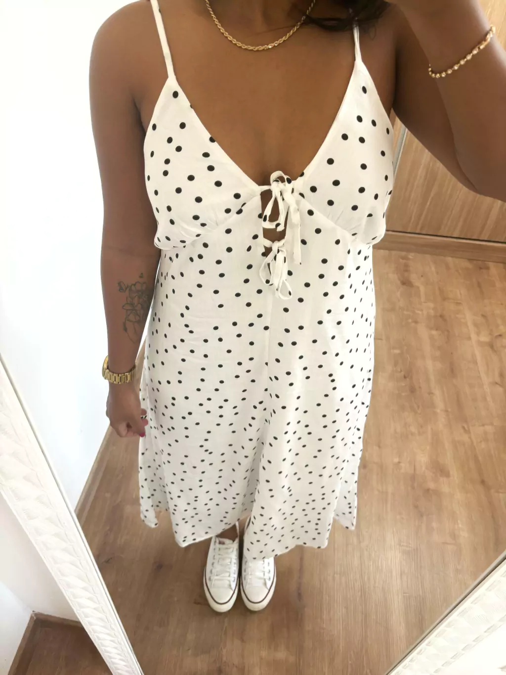Vestido longo Luna midi é confeccionado no tecido viscose, trazendo leveza e romantismo para a peça. Possui regulagem nas alças, amarração na frente e decote em V.
