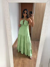 Este vestido destaca-se pelo seu acabamento único: a amarração nas costas proporciona um ajuste personalizado, enquanto o lastex na cintura valoriza a silhueta com delicadeza e conforto. O babado estilo três marias adiciona movimento e um toque romântico, conferindo charme e leveza ao visual.